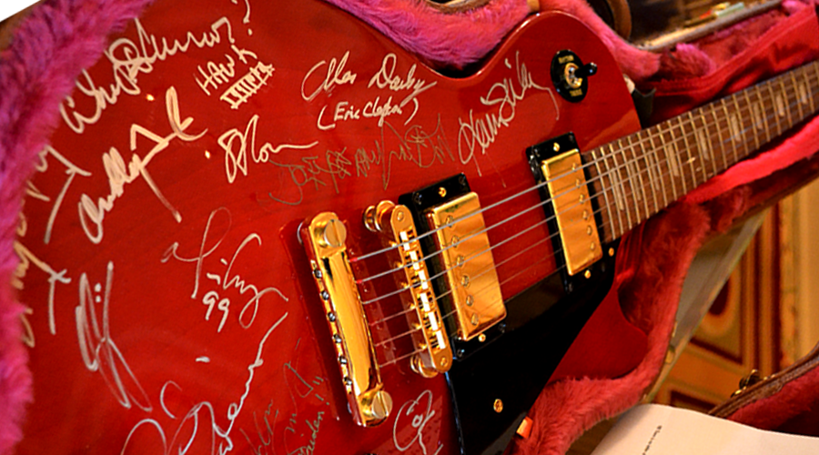 Having worked with many top music acts, it was only right that The Absolute Agency should acquire a genuinely impressive piece of rock ’n’ roll history…whilst most importantly donating to a genuinely worthwhile cause. The Absolute Agency was very proud to have been involved with this fabulous charity event in aid of Action for Brazil's Children Trust . We helped arrange a signed Brazilian football shirt by many Brazilian premiership players. Money was raised on the night and everyone enjoyed a thoroughly great evening.....and we walked home with a stunning memento! This fabulous guitar will take pride of place in the office and is sure to impress visiting clients…as long as they don’t try to play it – it hasn’t been touched since Jimmy Page and his famous rock pals played it in 1993, so may need tuning! This superb instrument was handed to Clare by Jimmy’s ex-wife who was very happy to see it go to a good home!